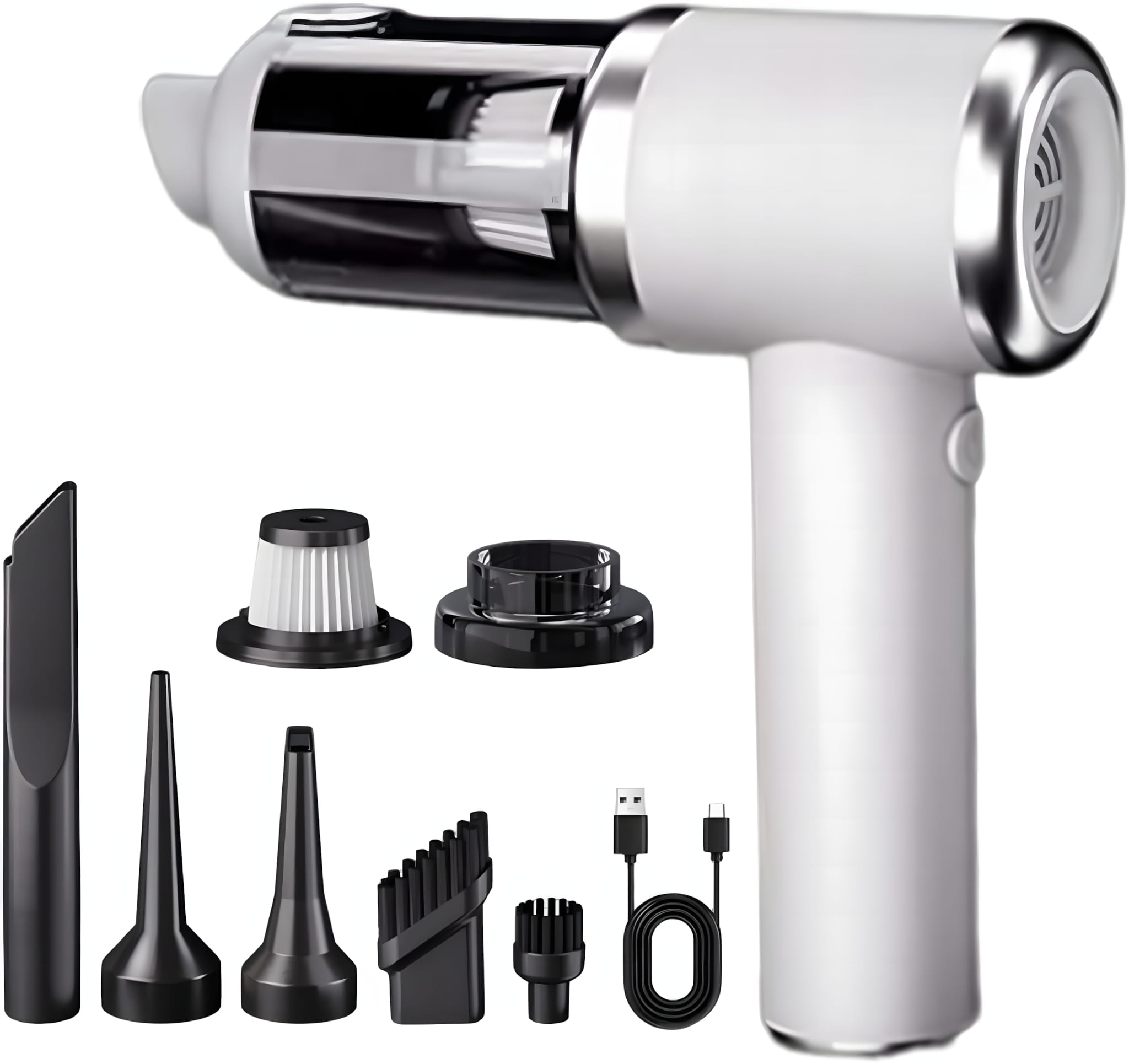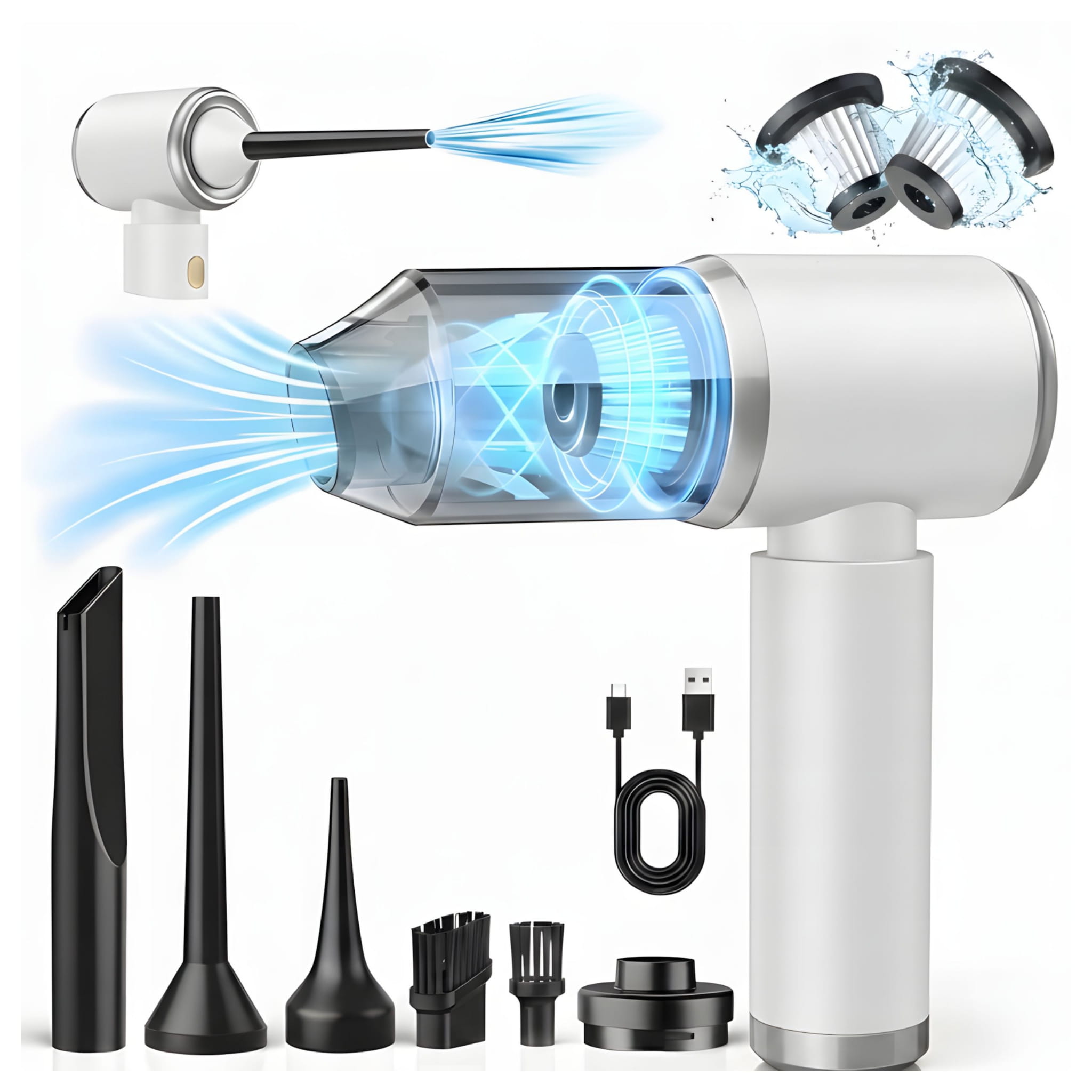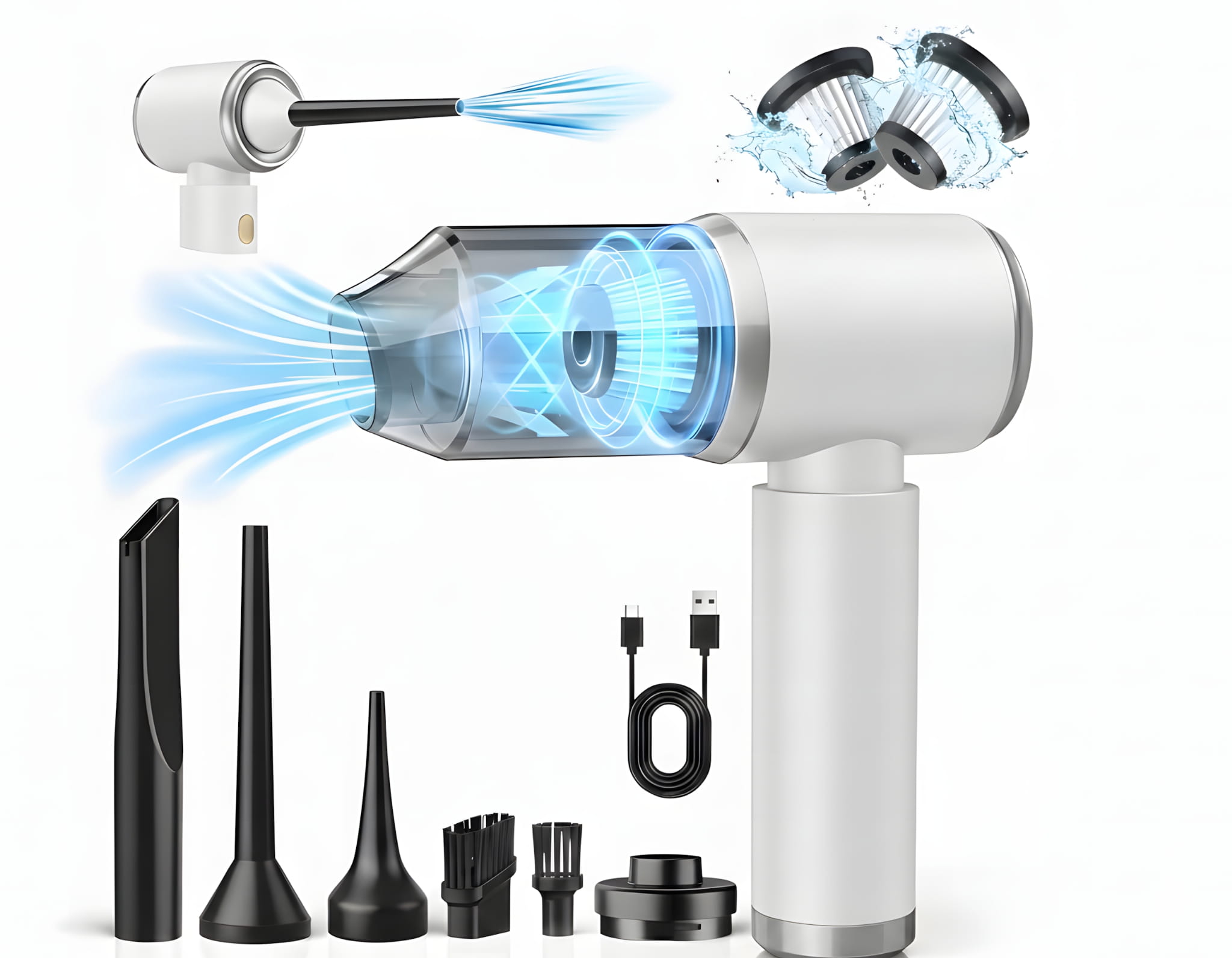 ✅ W komplecie otrzymujesz aż 6 końcówek, w tym szczotki i precyzyjne dysze do różnych powierzchni – od tapicerki po elektronikę. Dzięki nim dotrzesz wszędzie tam, gdzie zwykły odkurzacz nie da rady.