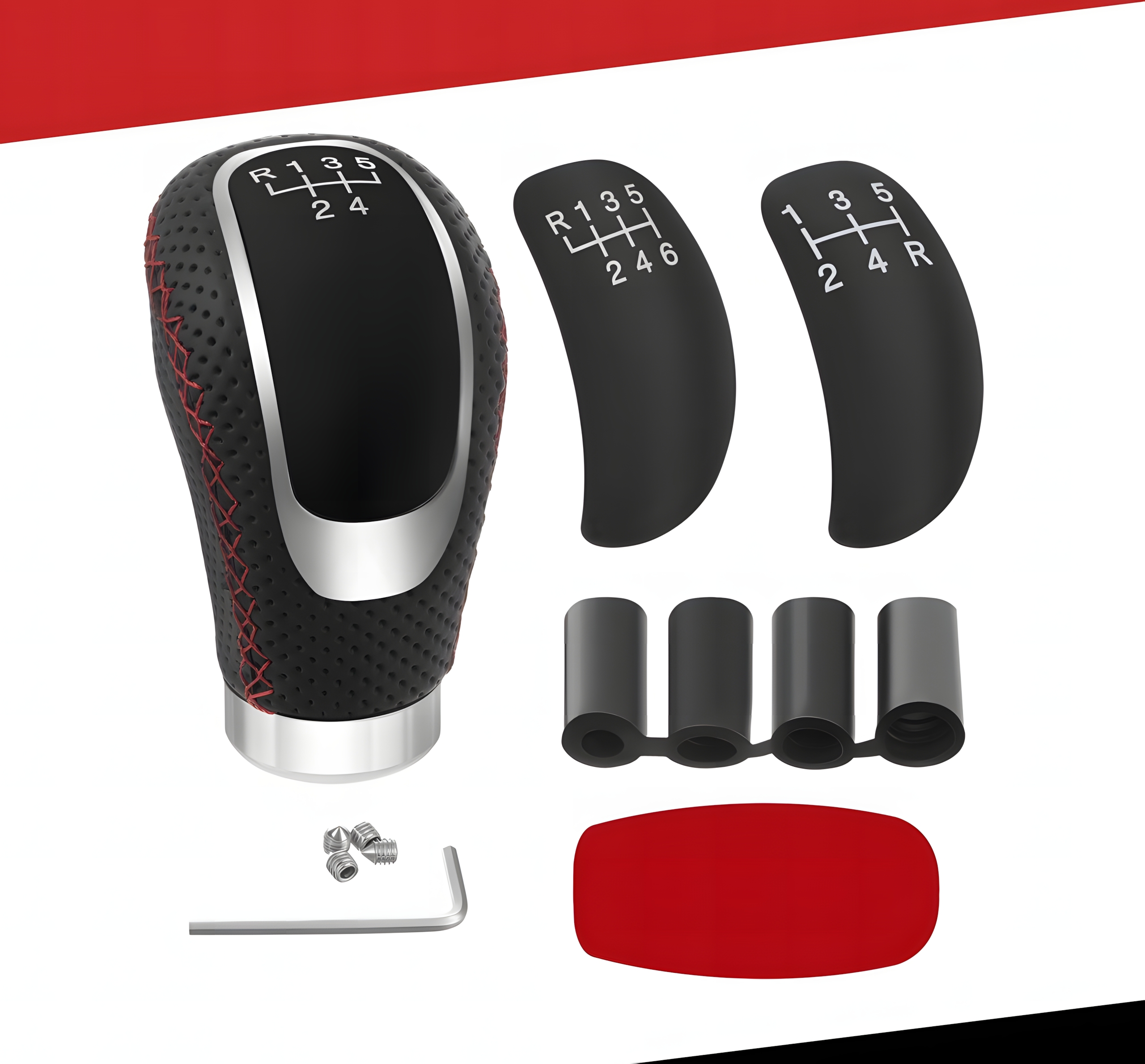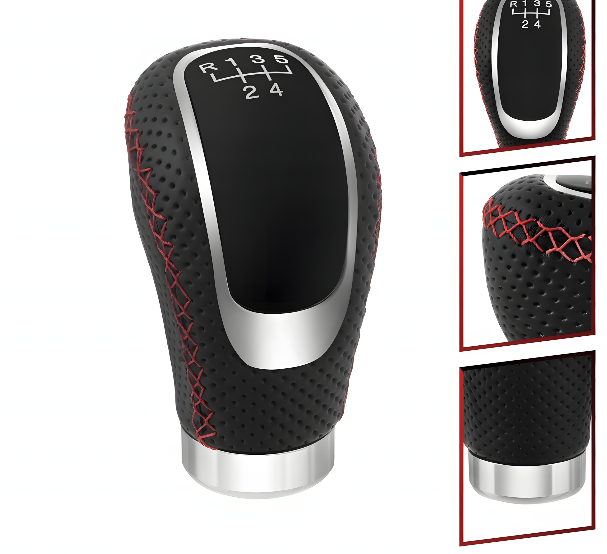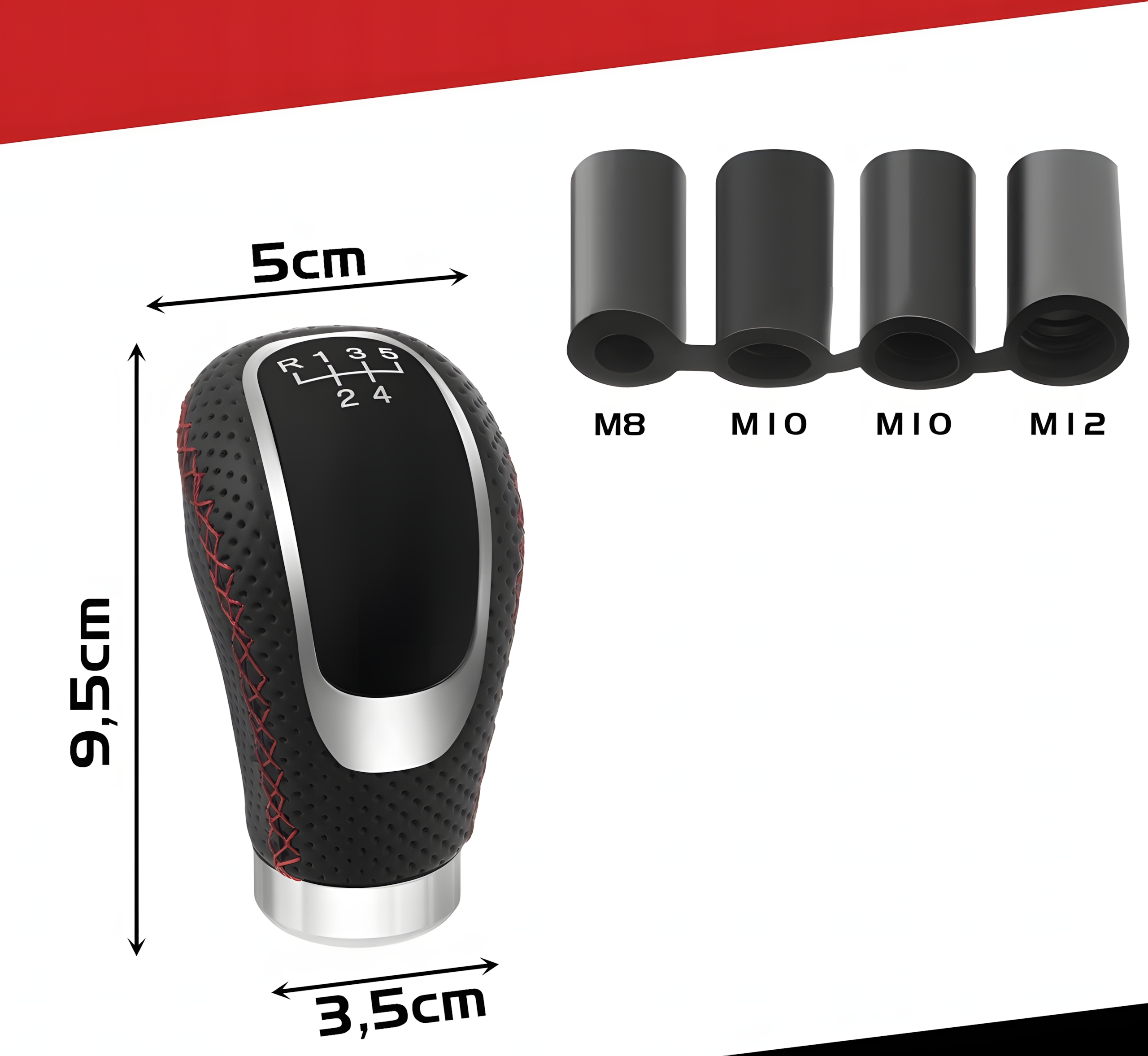 Gałka zmiany biegów uniwersalna skórzana PU 5/6 biegów + neutralny, sportowa czarna z chromem i czerwonym przeszyciem, adaptery M8 M10 M12, do manualnej skrzyni biegów, szybki montaż DIY