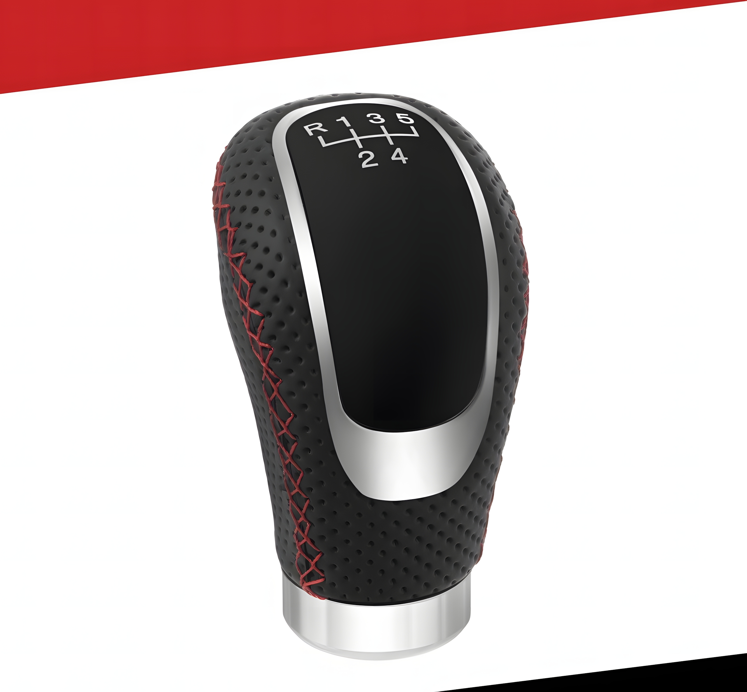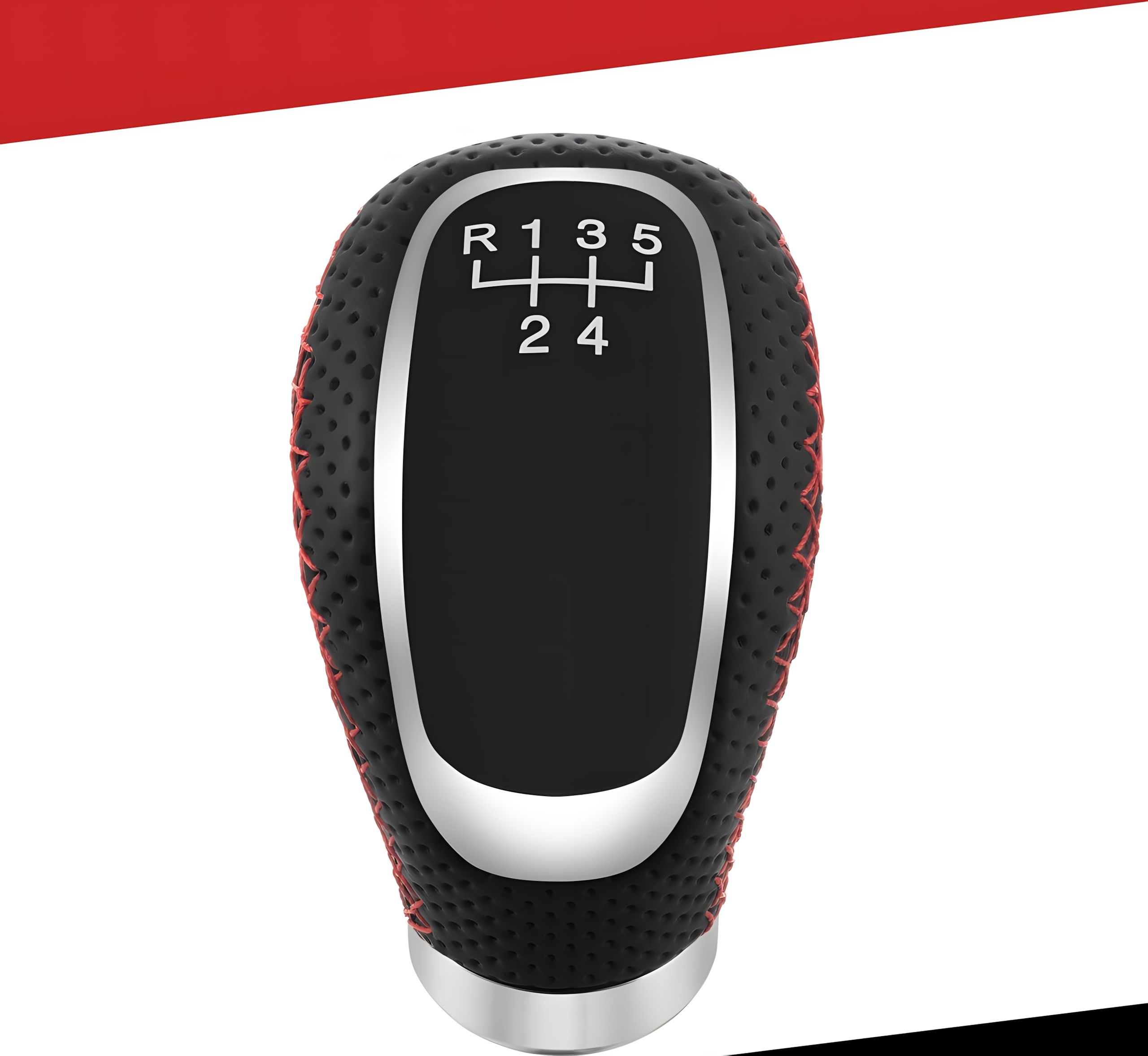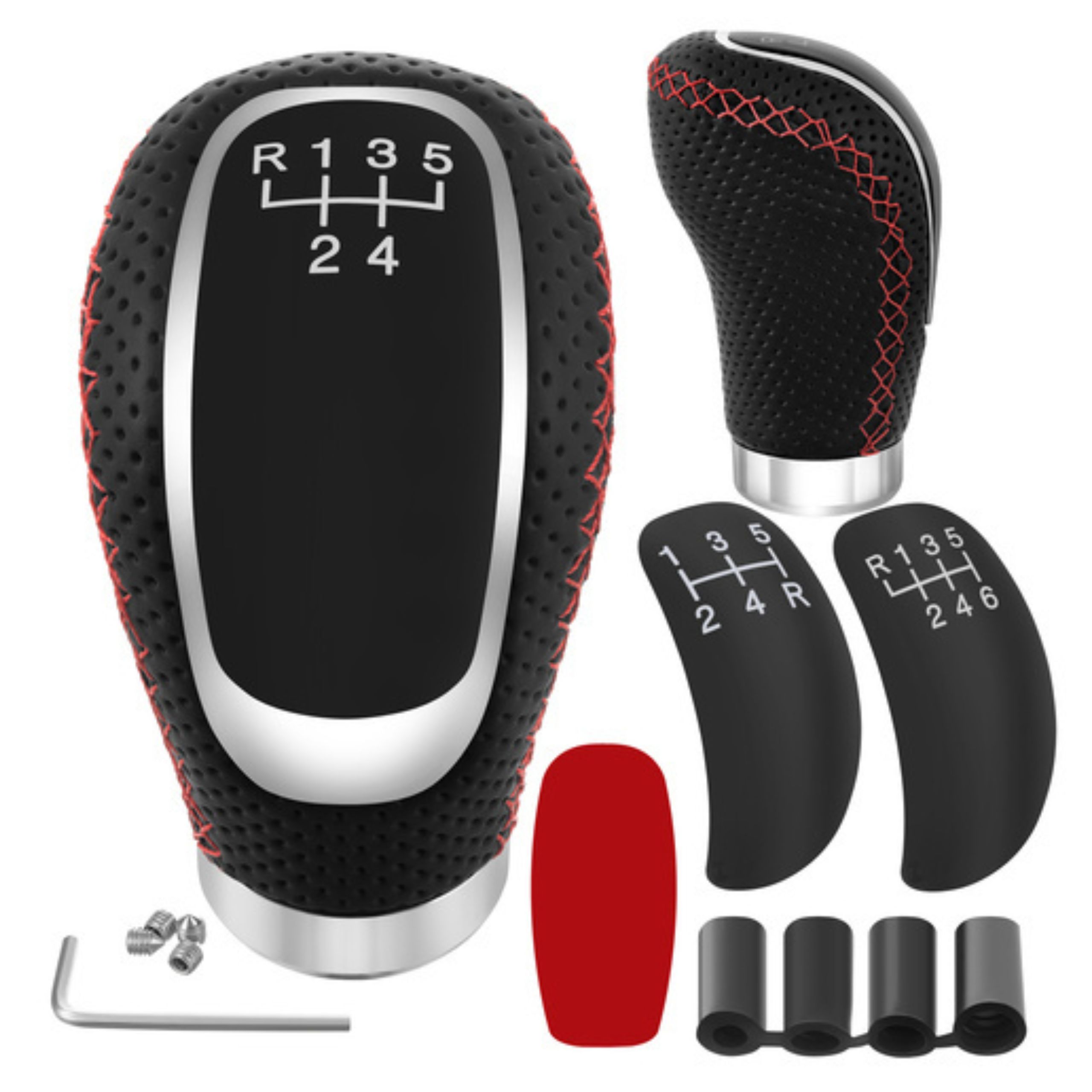 Gałka zmiany biegów uniwersalna skórzana PU 5/6 biegów + neutralny, sportowa czarna z chromem i czerwonym przeszyciem, adaptery M8 M10 M12, do manualnej skrzyni biegów, szybki montaż DIY