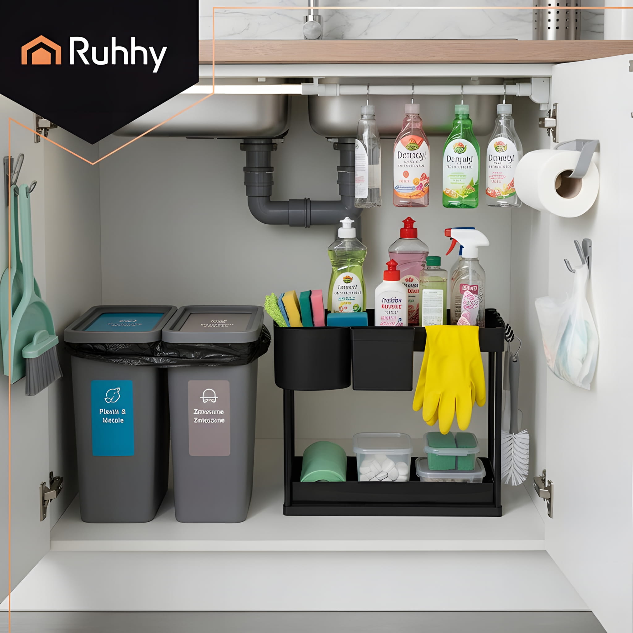 ✅ Dzięki dwupoziomowej konstrukcji organizer pozwala zwiększyć przestrzeń użytkową pod zlewem lub w innych wąskich miejscach. To idealne rozwiązanie do przechowywania detergentów, ściereczek, przypraw czy akcesoriów kosmetycznych.