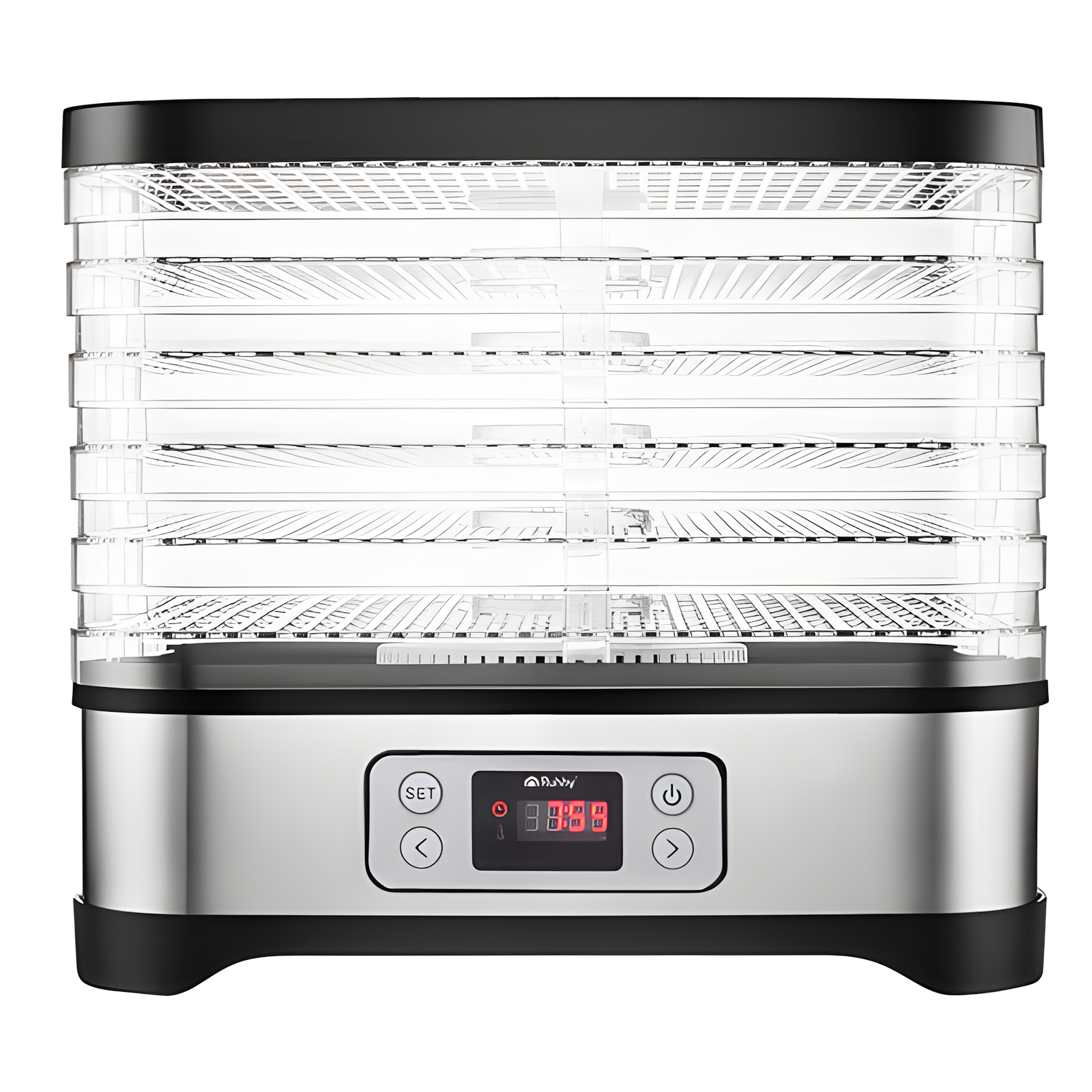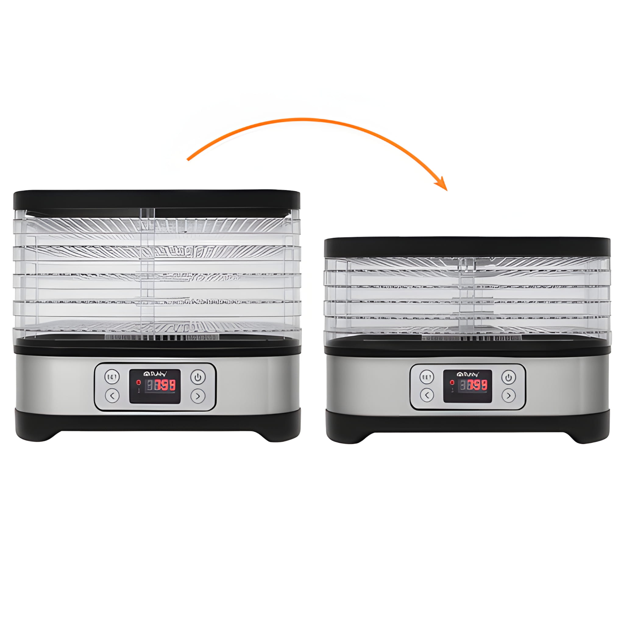 ✅ Wbudowany wentylator z termoobiegiem zapewnia, że powietrze cyrkuluje na wszystkich poziomach, a produkty są suszone równomiernie – bez konieczności zamiany tacek miejscami.